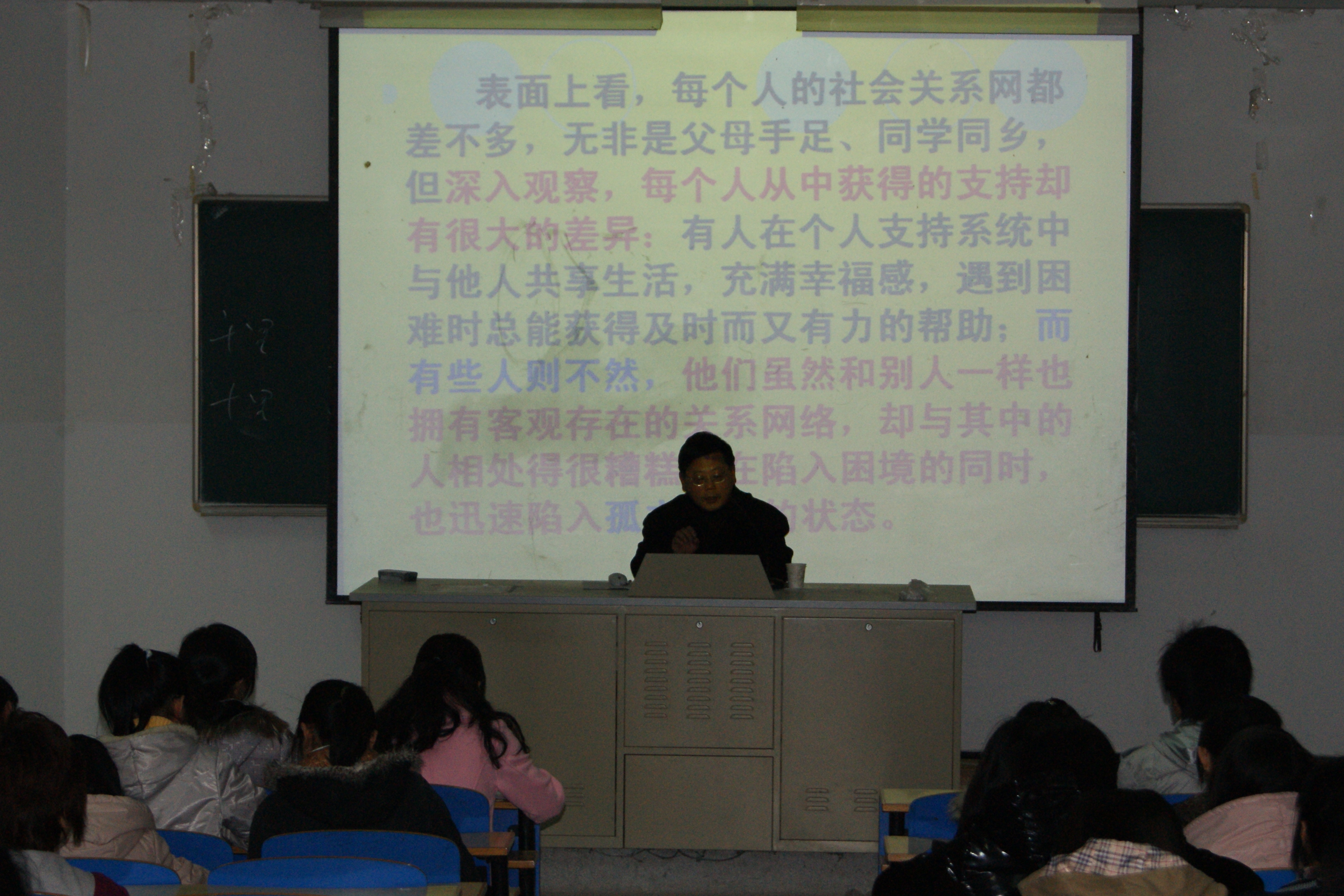 讲座中,卞书记介绍了社会支持系统的的含义并结合具体实例重点讲解了如何获得社会系统的支持,以及社会支持系统对人的健康心理的重要意义。卞书记以典型生动的实例和轻松诙谐幽默的语言赢得了同学们的阵阵掌声,为在场的大学生们正确处理人际关系提供了积极有益的指导,也有利于构建和谐的宿舍关系。最后,卞书记向在场的学生表达了期望:建立社会支持系统,从宿舍开始。