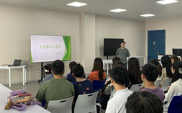 金永平博士向各位同学介绍并分析当下学术界中几种重要的翻译理论,并结合个人多年的欧美诗歌阅读、翻译及研究经验,通过解读拜伦、罗伯特·彭斯、卞之琳、曹雪芹等作家的作品译文,让大家了解一首首译作的呈现过程,从而领略语言的表现力,懂得欣赏中英文诗歌之美。金永平博士用许渊冲先生 “译诗六论” 作为本次讲座的结束话题,他勉励大家多阅读中英文诗歌,提高文学作品的阅读能力。