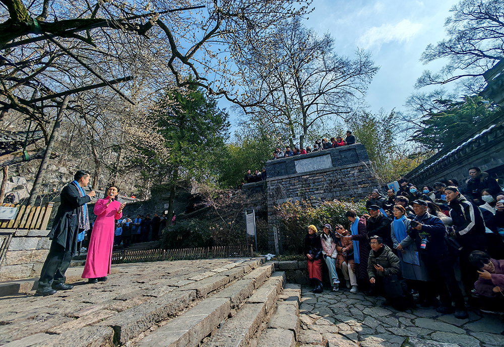 “欧梅咏芳”诗歌雅会开幕式分为迎梅、咏梅、拜梅三段进行。千年古梅,老干虬枝,树影婆娑,花开依旧。在小朋友“欧梅开啦,欧阳修爷爷来啦”的欢呼声中,吟诵《醉翁亭记》片段和古诗《忆滁州幽谷》的欧阳修扮演者踱步登场。接着,一位位朗诵者接续诵读先贤佳作,古琴、琵琶、竹笛演奏者纷纷演奏经典曲目,书法家在“花中巢许”台前挥毫泼墨、礼拜欧梅,千册诵梅诗词口袋书《欧梅咏芳》赠阅游客。笛子名曲《琅琊神韵》悠扬婉转,完美呈现了琅琊山中四时之景不同的乐亦无穷的意境。