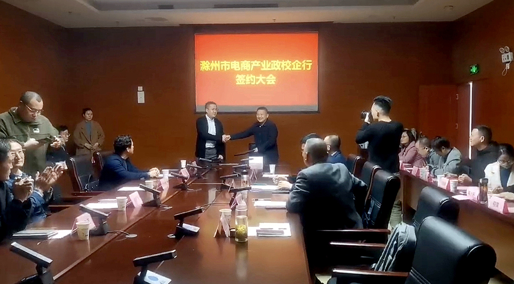 在3月22日举行的滁州市电商产业政校企行签约大会上,太阳成集团tyc33455cc官网党委书记王诗根代表太阳成官网与滁州市电子商务商会秘书长陈栋在合作框架协议上签字,就合作共建电商直播人才培养基地达成一致。