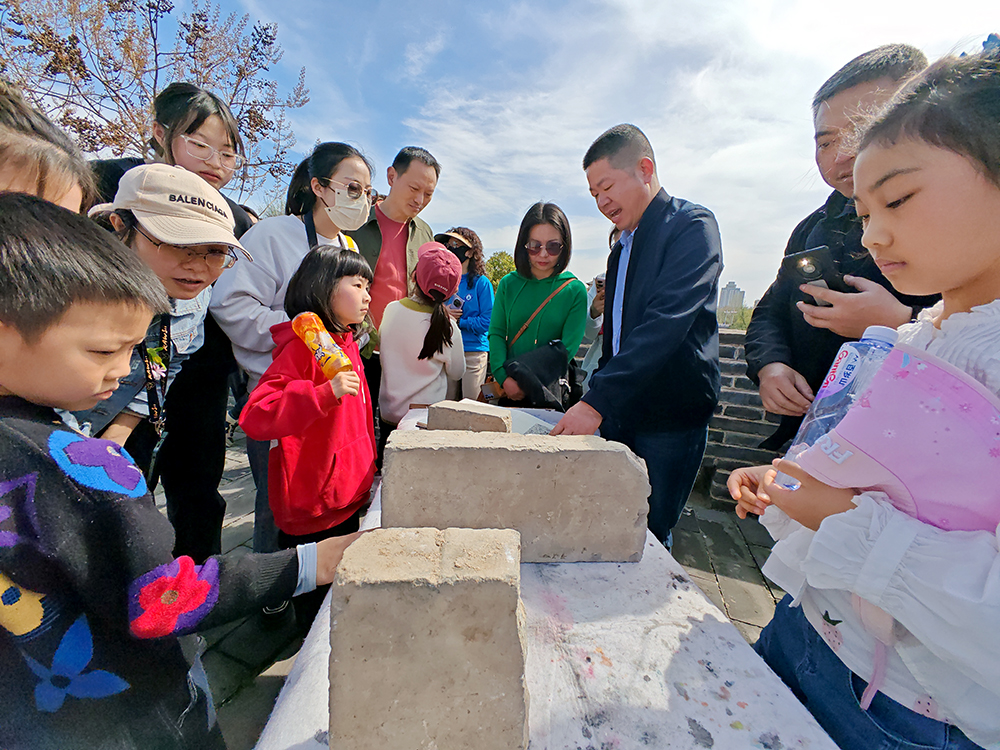 上水关前,灰石疏豁。上水关始建于宋代嘉定年间,明代嘉靖年间重修。“嘉定十年滁守……節制”,关口孔圈嵌砖的刻字,在诉说着历史的沧桑。游览上水关,顿觉古风席面,颇有古道雄风的既视感。大家聆听着讲解,追随着历史的痕迹,慢慢体会西涧水流淌古关口的悠悠风韵。民间收藏家汪庆才在此展示了他收藏的古城砖上的刻字,并现场拓字送与参加活动的学生们。