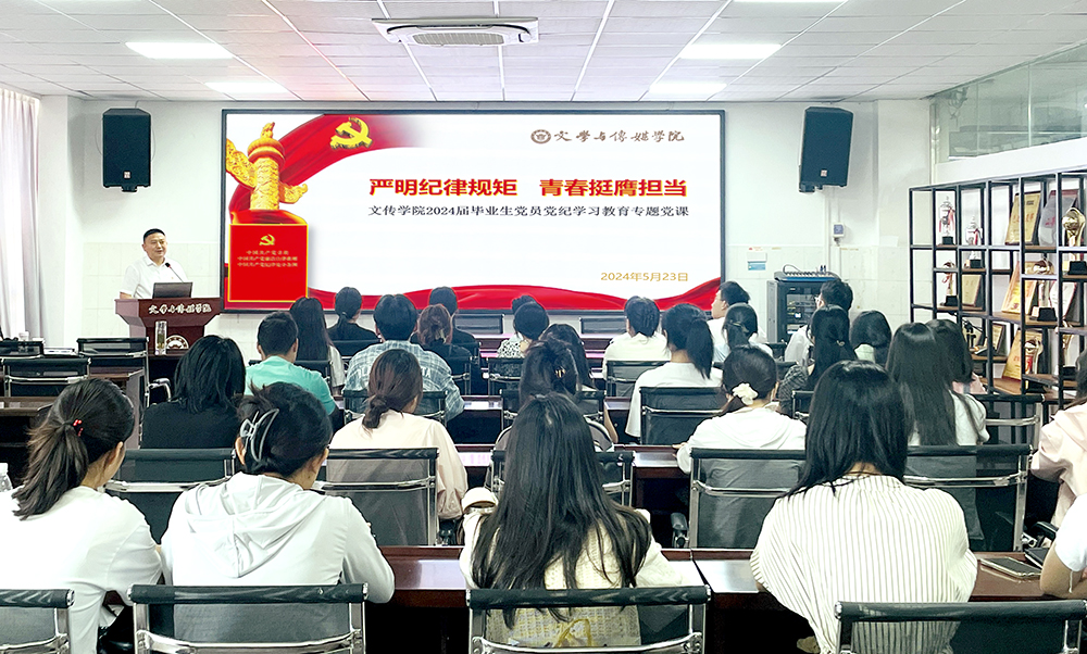 5月23日,文学与传媒学院召开毕业生党员党纪学习教育大会,专题学习《中国共产党纪律处分条例》,聆听党课报告,为他们迈向人生新征程护航把舵